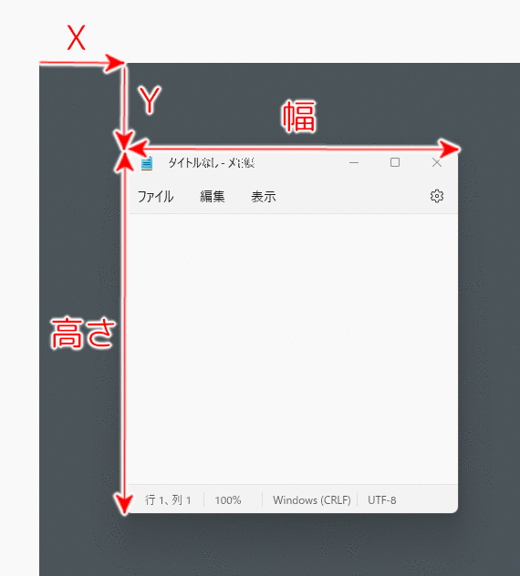 「X」は、「画面左上」から「ウィンドウの左上」までの「横方向の距離」です。