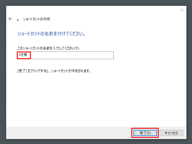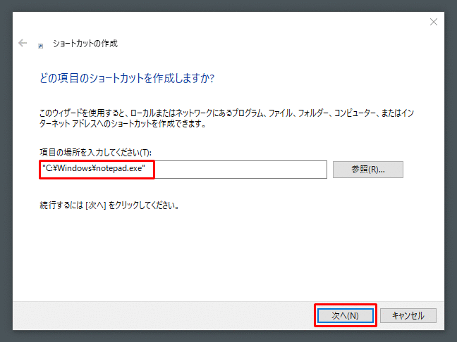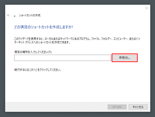 ショートカットの作成画面で、「Ctrl」キーを押しながら「V」キーを押し、