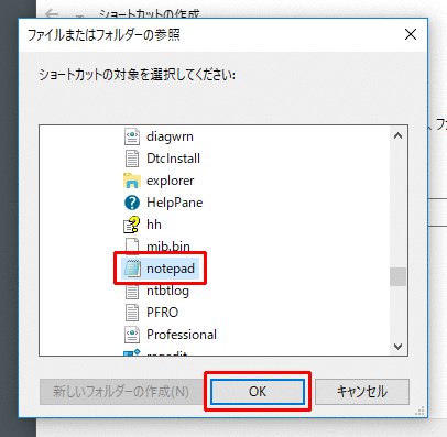 ファイルまたはフォルダーの参照画面で、ショートカットを作成する対象までクリックして開いて行きます。