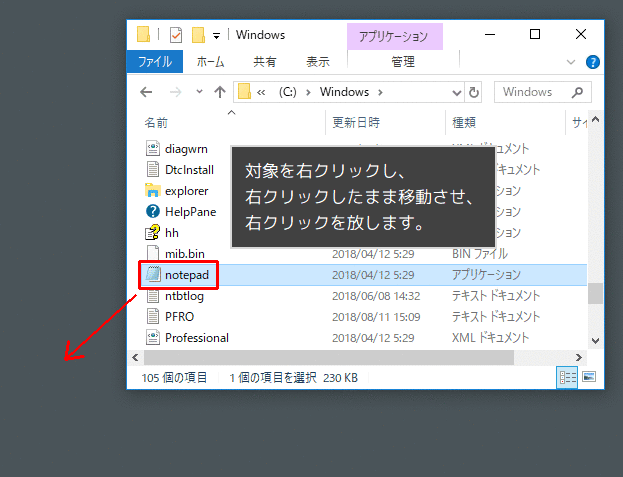 右クリックしたまま、デスクトップやフォルダの余白部分まで持って行き、