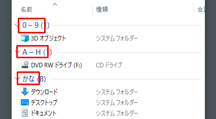 Windows10の「PC」フォルダ等が「0-9」「A-H」「I-P」「かな」「漢字」等で表示される場合の対処法