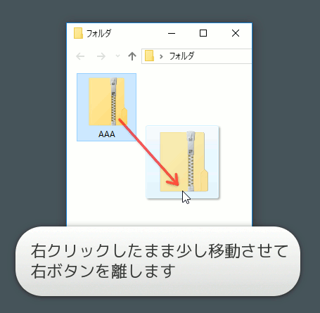 マウスの右ボタンを押したまま、フォルダやデスクトップの余白部分等に移動させ、マウスの右ボタンを放します。