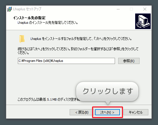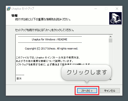「Lhaplus セットアップ」の「情報」という画面が出ますので、「次へ」をクリックします。