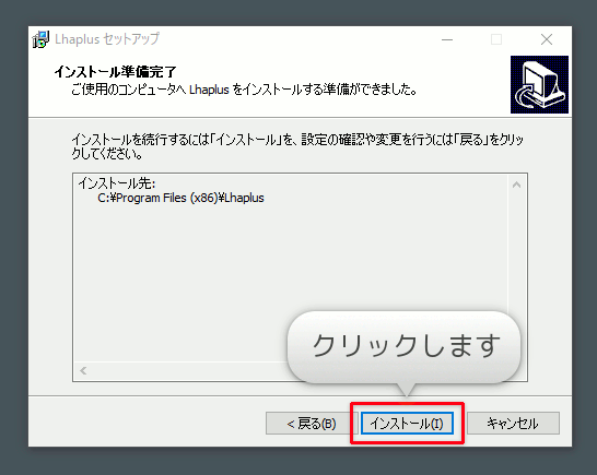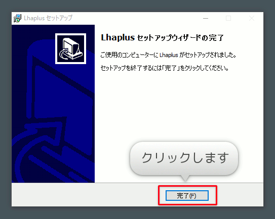 「Lhaplus セットアップウィザードの完了」という画面で、「完了」をクリックします。