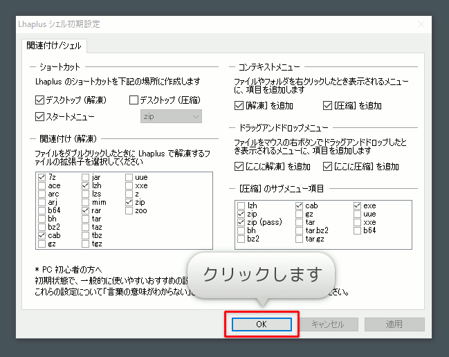 「Lhaplus シェル初期設定」という画面で、「OK」をクリックします。