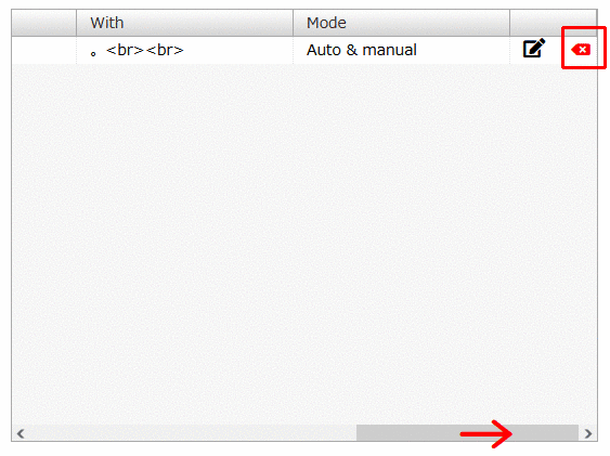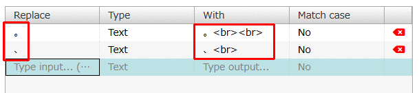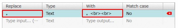 「With」の下の入力欄をクリックして、「。<br><br>」と入力して(「<br>は半角」)、Enterキーを押します。