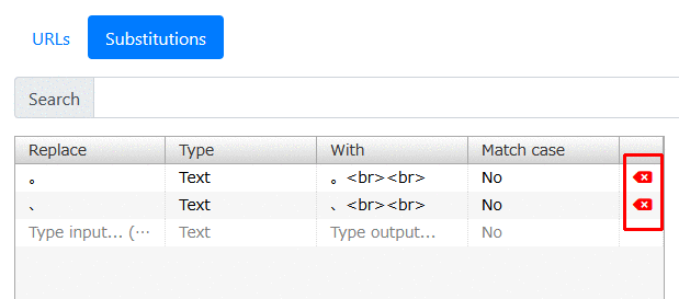 置換設定を削除したい場合は、「Substitutions」をクリックし、対象置換設定の右端にある「×」をクリックします。(あるいは、その項目をクリックして選択して、「Delete」キーを押しても良いです。)