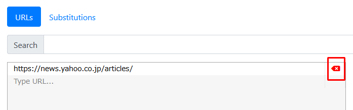 URLの設定を削除したい場合は、「URLs」をクリックし、対象URL設定の右端にある「×」をクリックします。(あるいは、その項目をクリックして選択して、「Delete」キーを押しても良いです。)