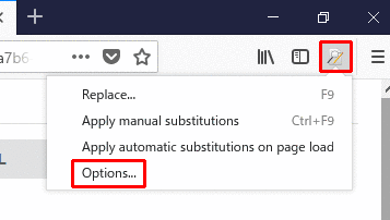 右上にあるFoxReplaceのアイコンをクリックし、「Options...」をクリックします。