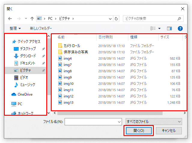 右の欄で、送信するファイルをダブルクリックするか、1度クリックしてから「開く」ボタンをクリックします。